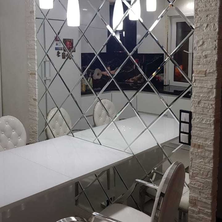 Обеденная зона кухни – это как раз то место, где зеркало можно разместить без всяких проблем. У хозяйки не будет опасений испачкать его, брызнуть жиром или обдать паром из кастрюли. Конечно, наша зеркальная плитка выдерживает и не такое, но чем меньше волнений, тем лучше.