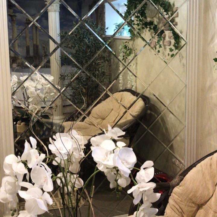 Использована серебряная глянцевая плитка квадратной формы, размером 18х18.